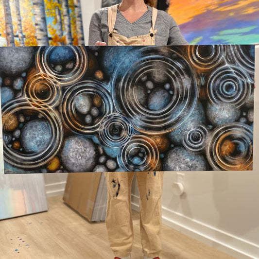 Melissa’s work transports the viewer to the lake on a warm summer’s evening, canoeing on calm waters, or dancing in the rain…. from walking along the beach and skipping stones, to the warmth of a campfire on a starry night.