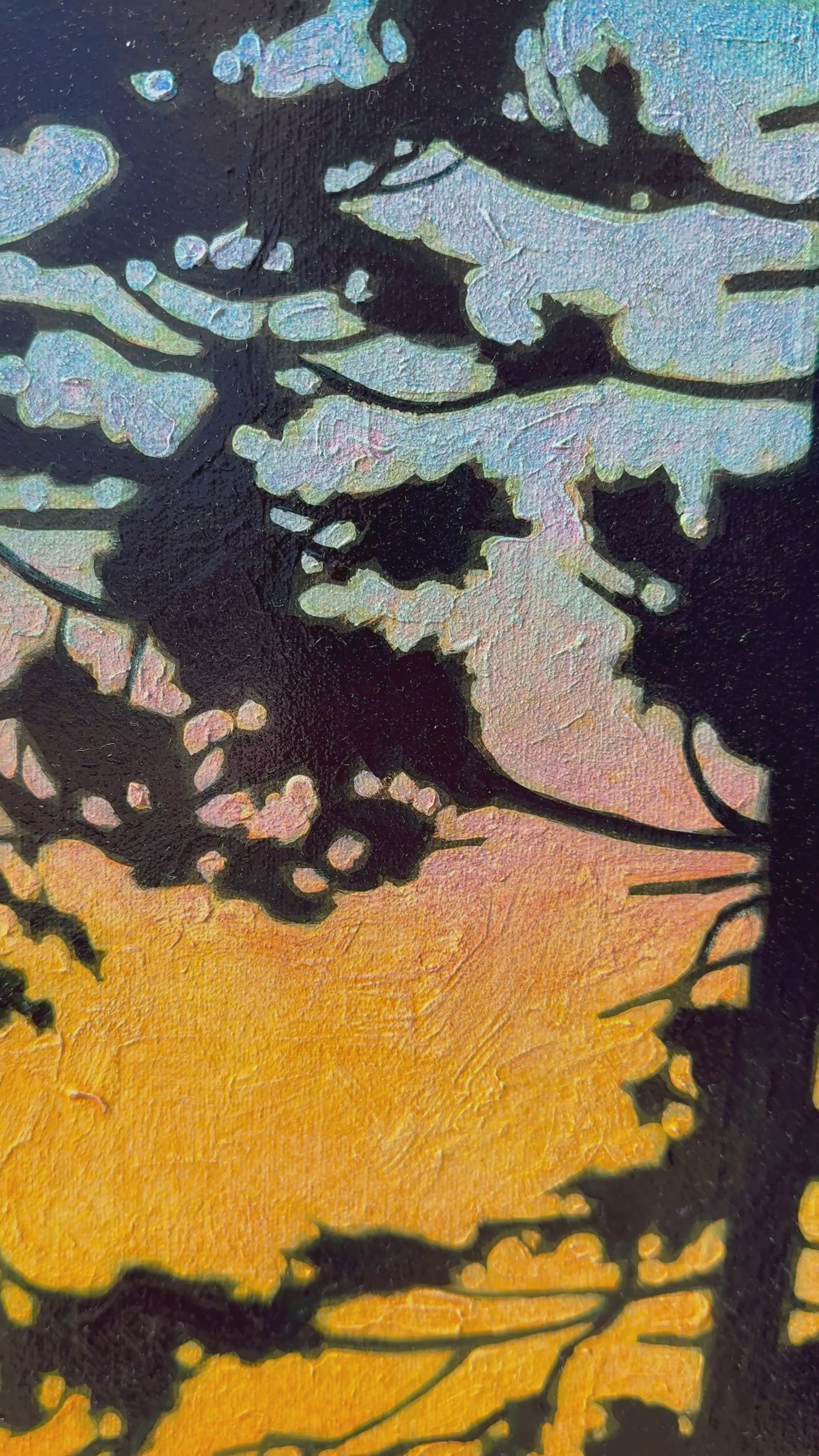 Bring the outdoors in with this original one-of-a-kind painting. On 1.5" wooden stretcher, sides painted black, ready to hang as is. This sunset painting is full of texture and layers of paint, and makes for a unique gift or addition to any space... home, office or cottage. Perfect size for over a couch or feature wall.