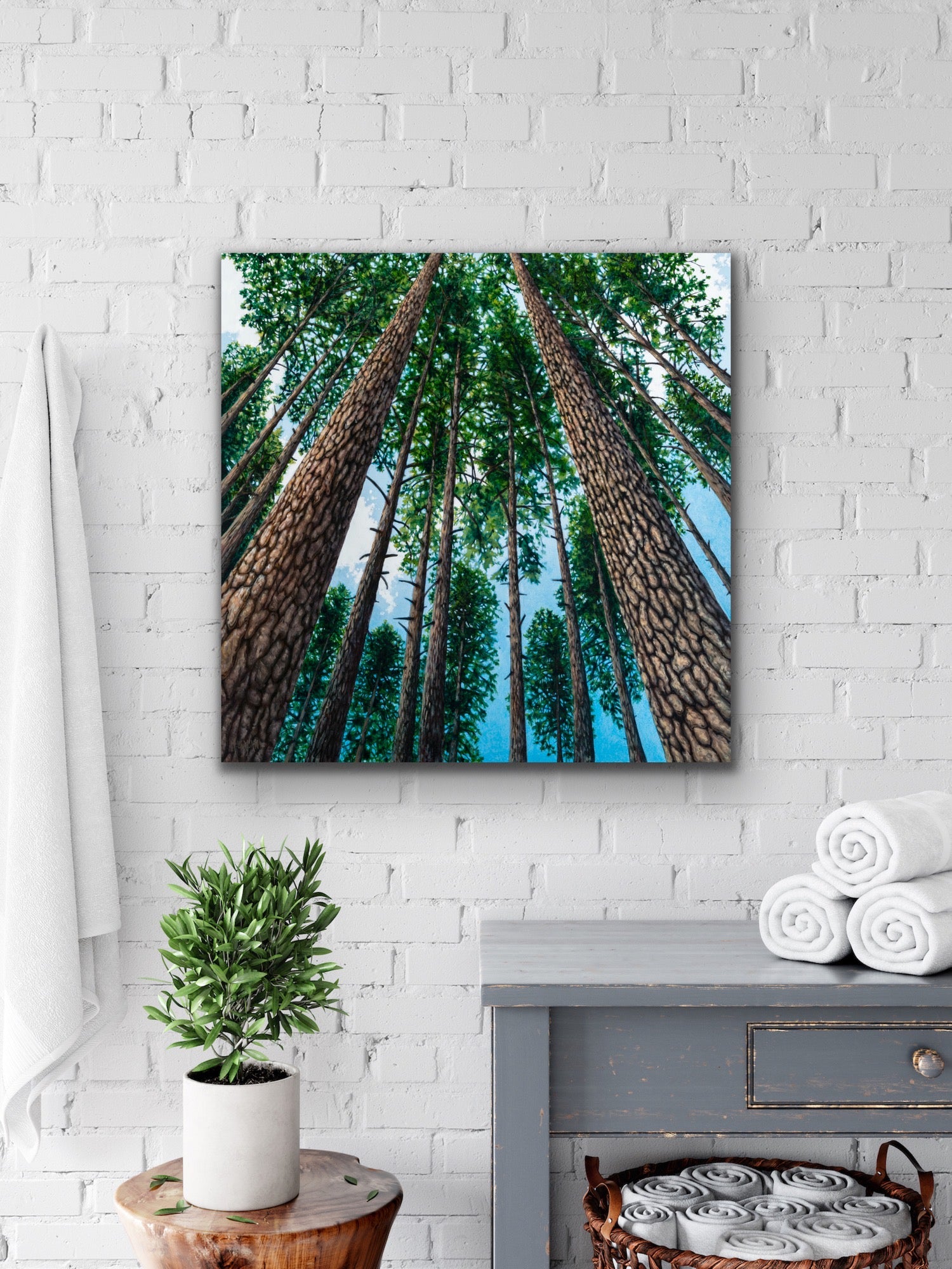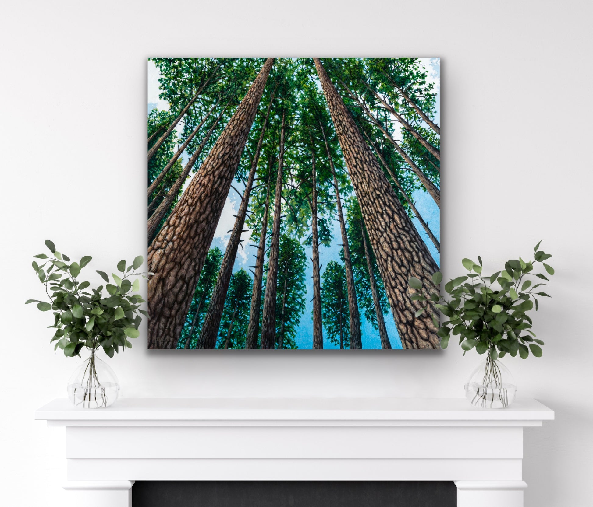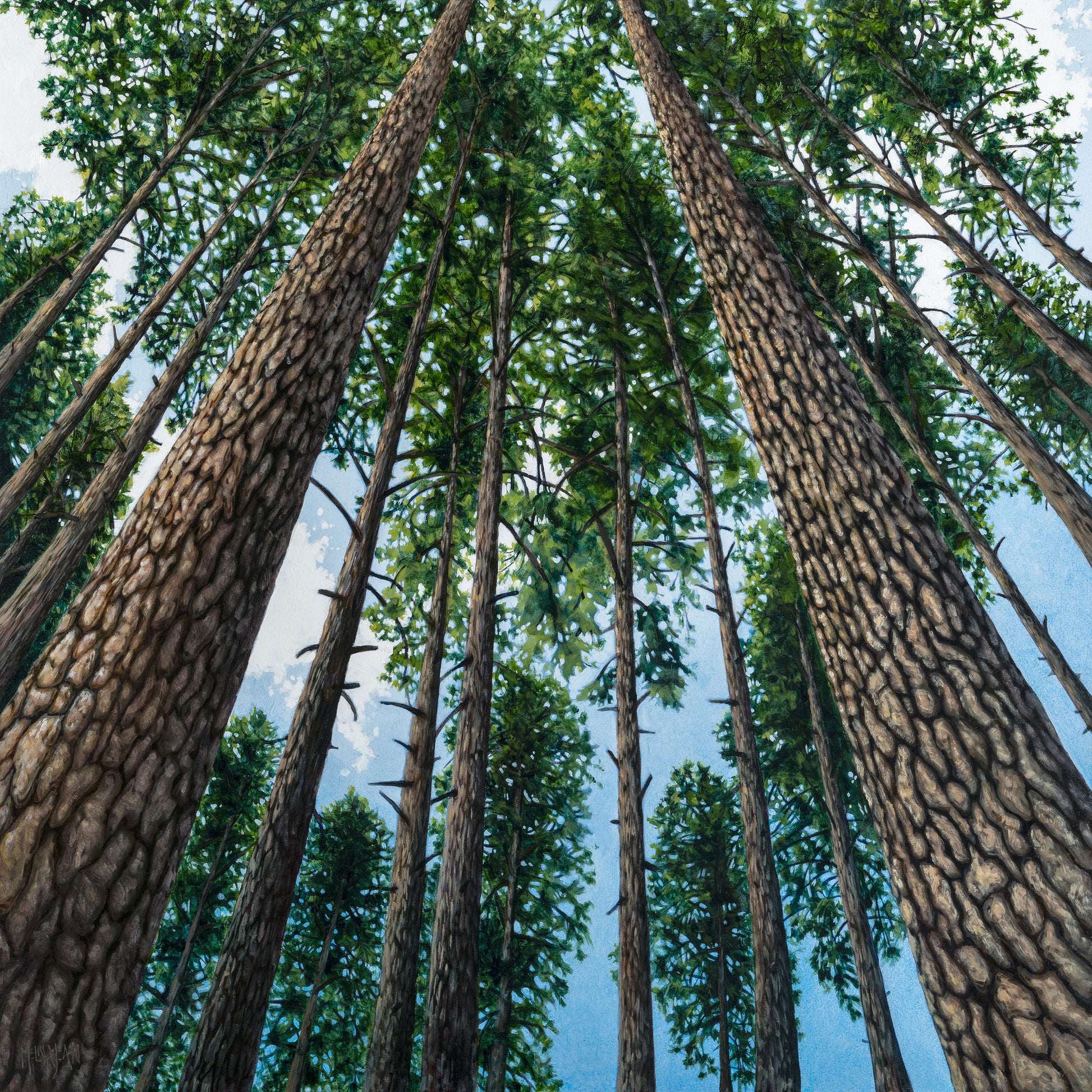 What inspired this painting: Inspired by hikes in Vernon Nature Trails towards Lake of the Woods, many people know the stand of tall pines on the way. This painting represents optimism, and hope. It offers a perspective of how small we are in relation to the Universe, how small and far away problems feel when in the forest, and personally speaking, how embraced I feel, just being in the forest.