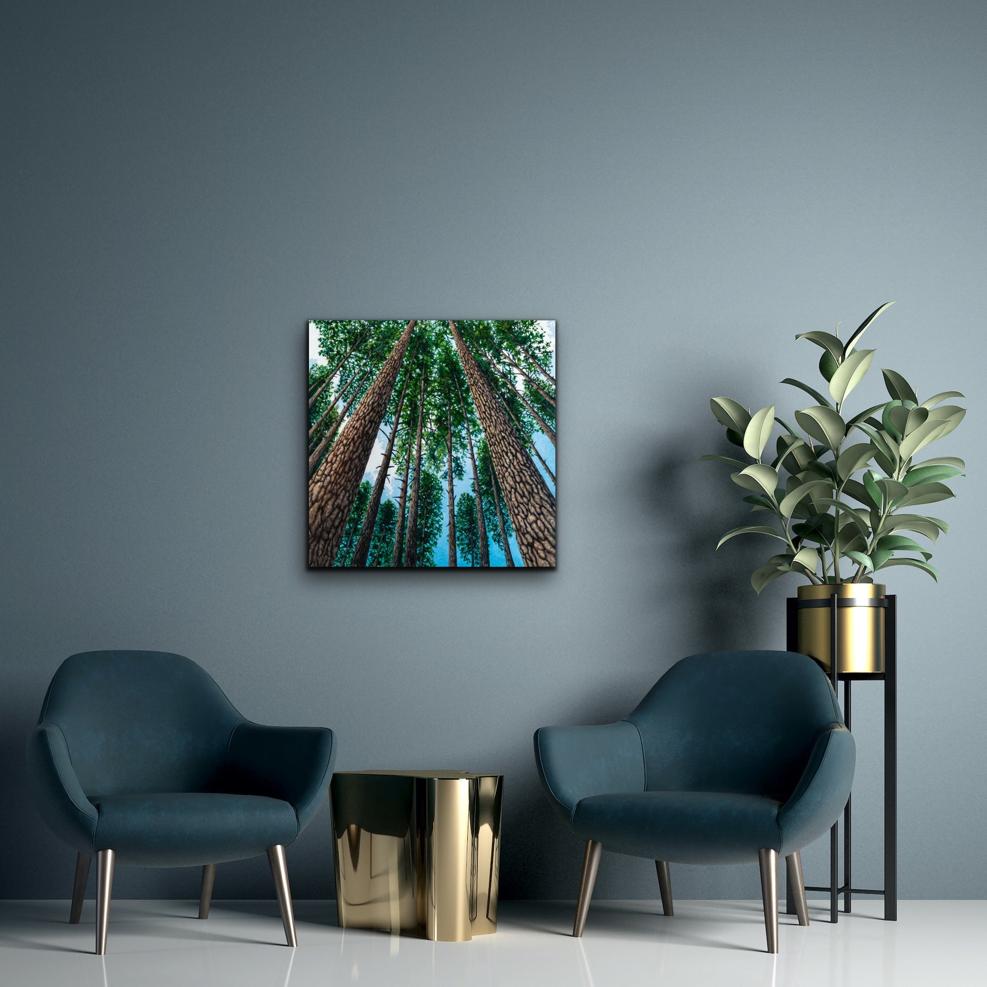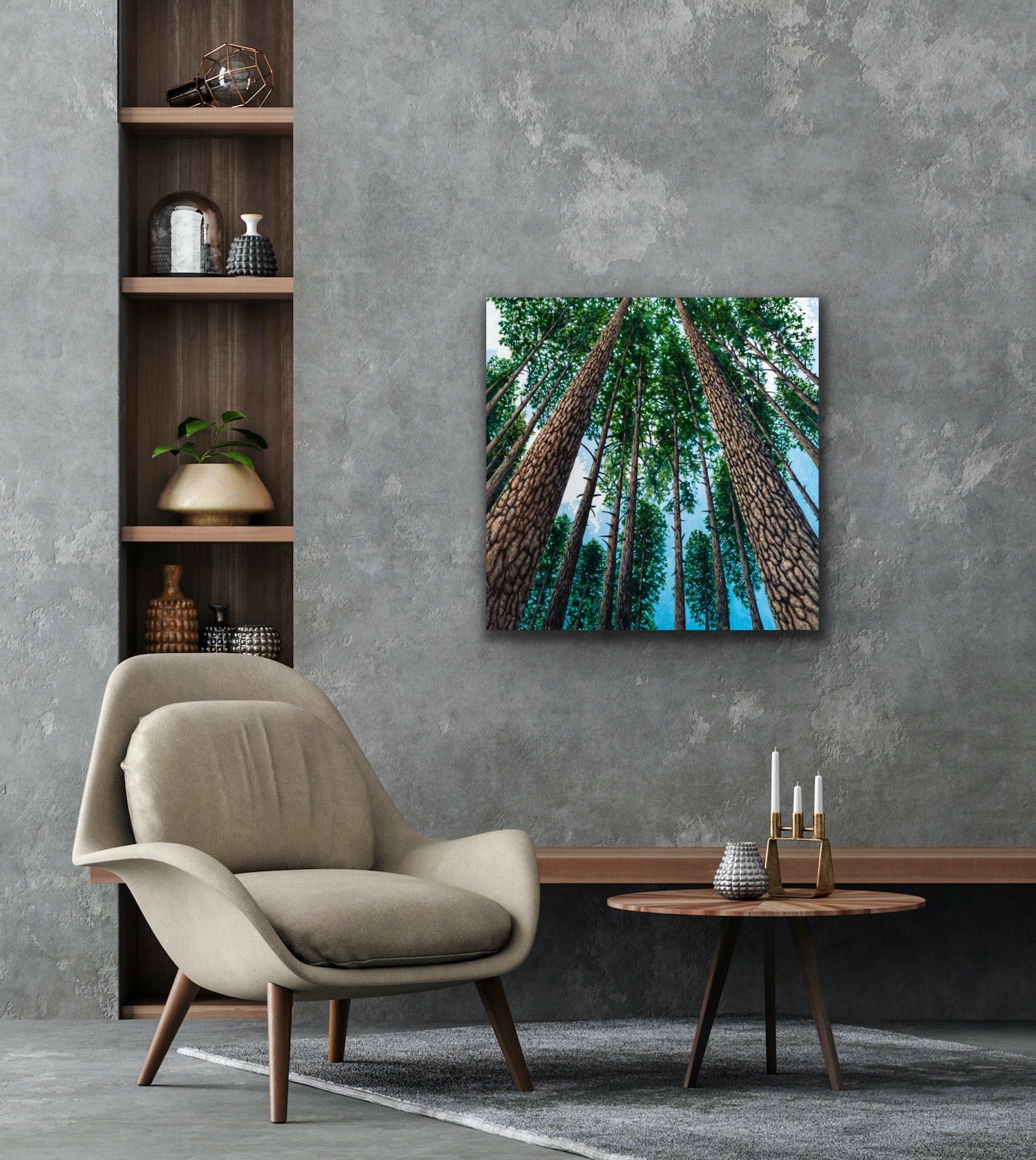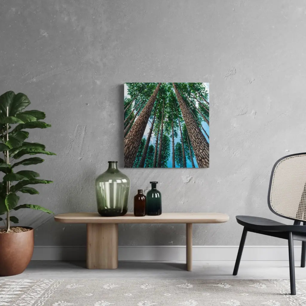 What inspired this painting: Inspired by hikes in Vernon Nature Trails towards Lake of the Woods, many people know the stand of tall pines on the way. This painting represents optimism, and hope. It offers a perspective of how small we are in relation to the Universe, how small and far away problems feel when in the forest, and personally speaking, how embraced I feel, just being in the forest.