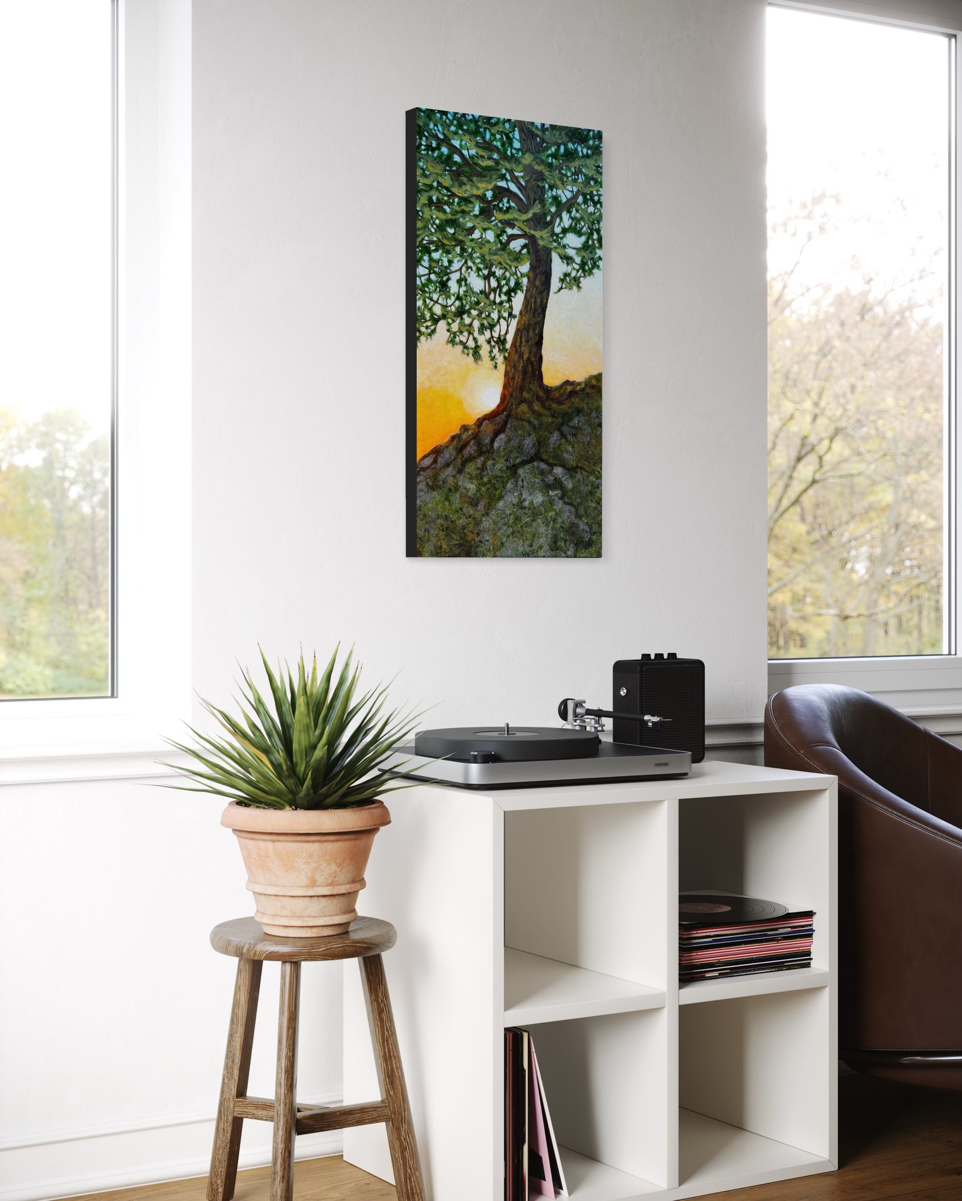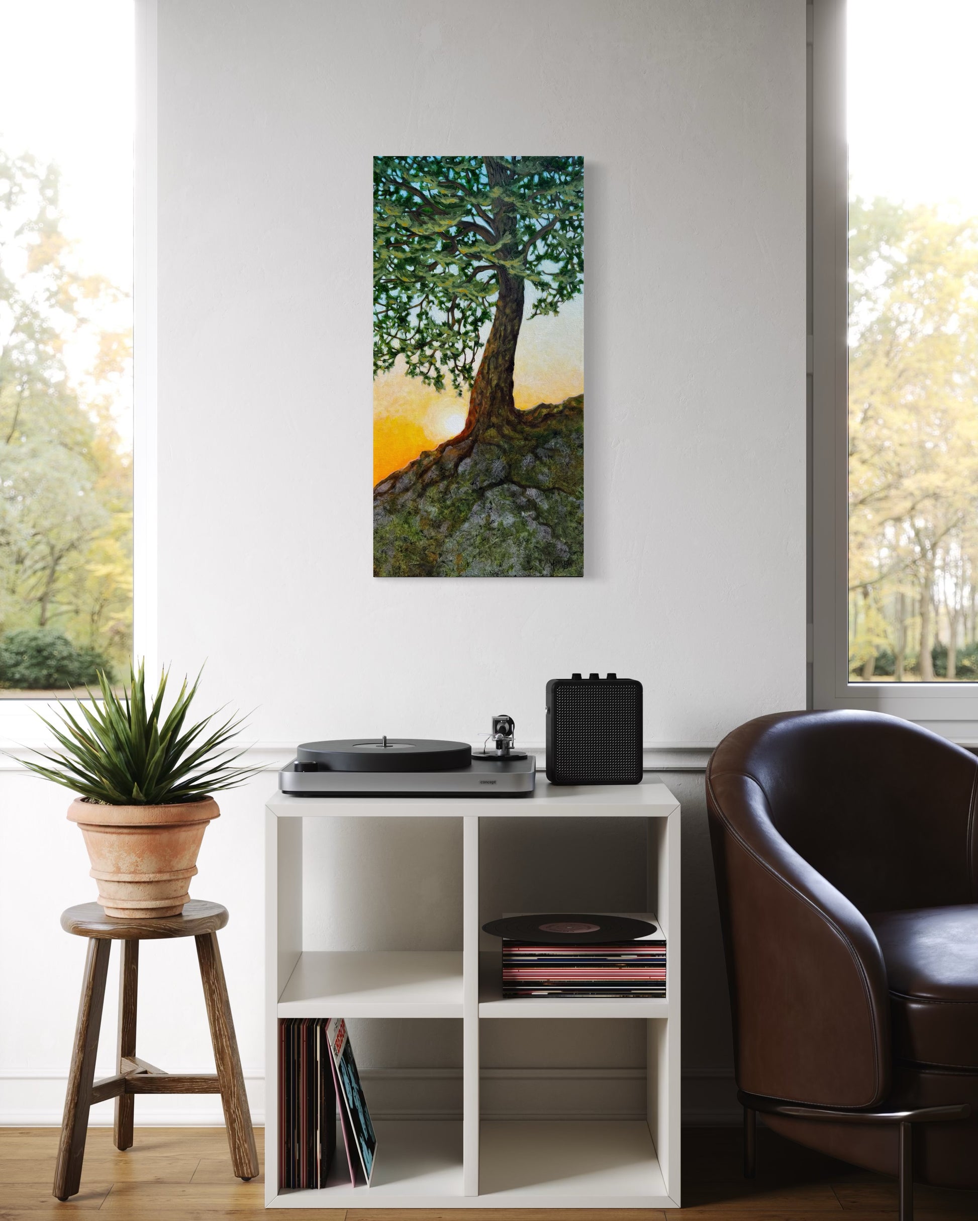 Bring the outdoors in with this original one-of-a-kind painting. On 1.5" wooden stretcher, sides painted black, ready to hang as is. Inspired by the unwavering strength of a pine tree's roots gripping the rock, this painting symbolizes resilience and the embrace of a new day. Full of texture and layers of paint, this original artwork makes for a unique gift or addition to any space... home, office or cottage.