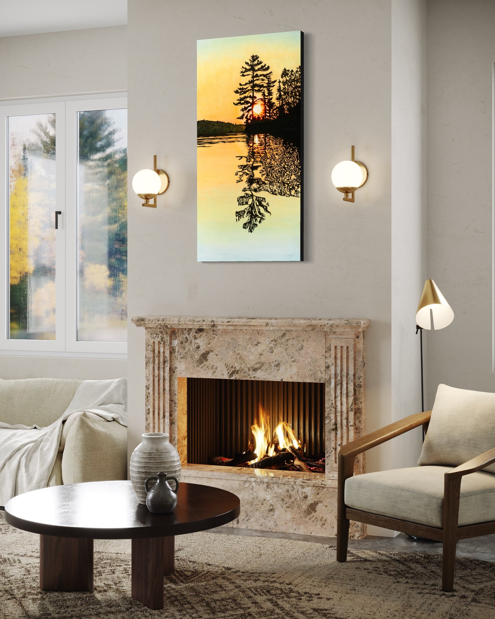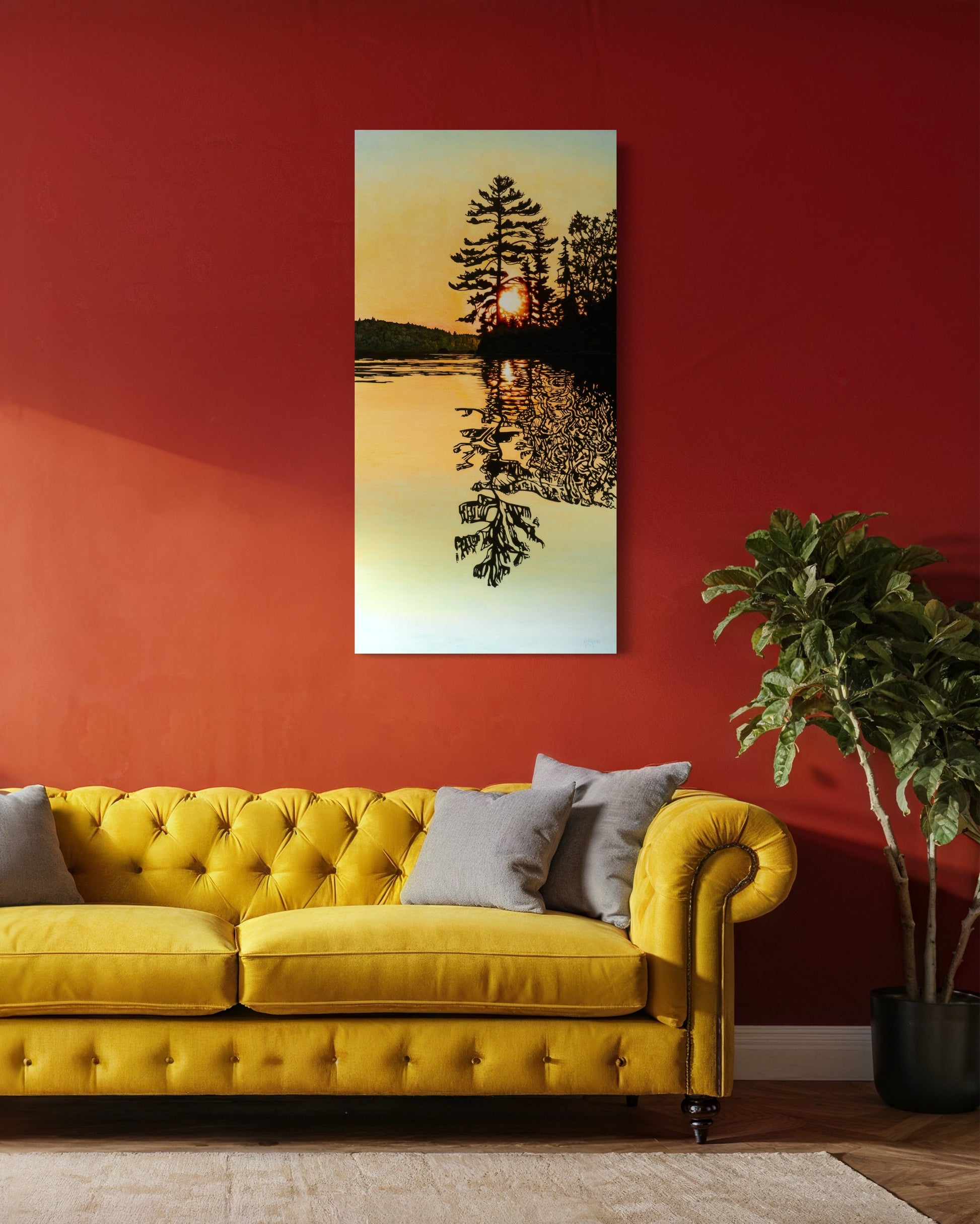 Ready to hang as is, without a frame, with a hook and wire on the back, and sides painted black. Archival Varnish applied for UV and pollutant protection to ensure that the colours will never fade, and it is safe to hang anywhere. (Clean with a damp cotton washcloth or dry washcloth only)