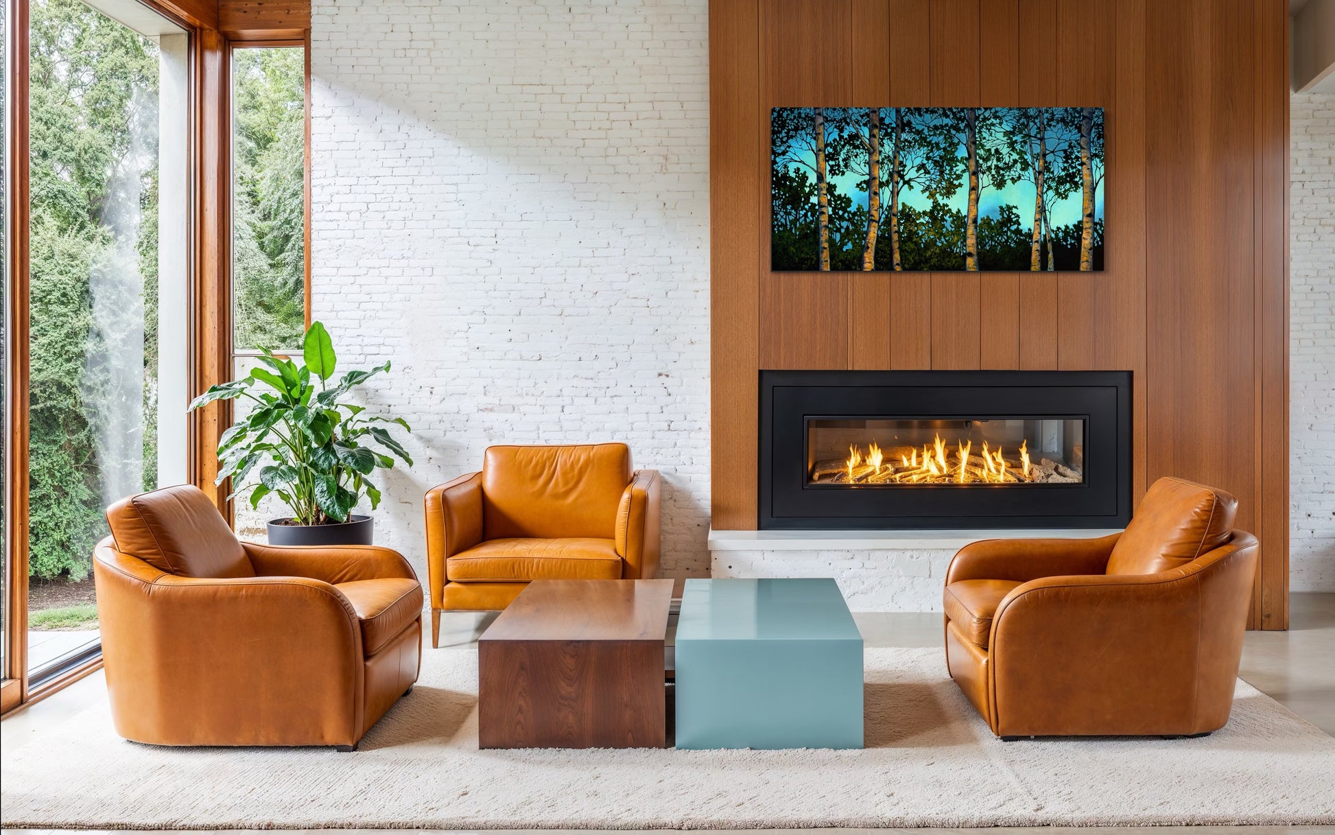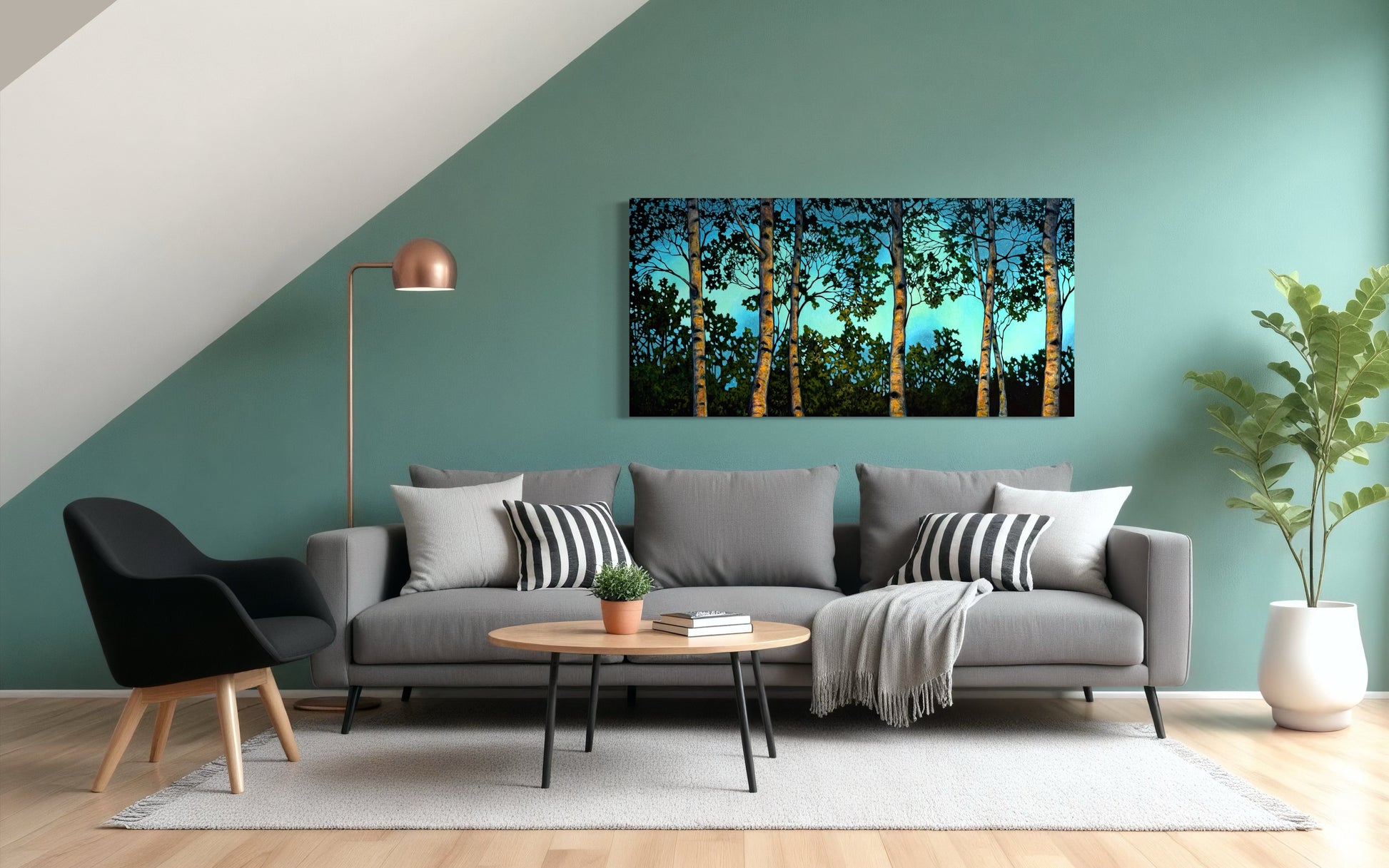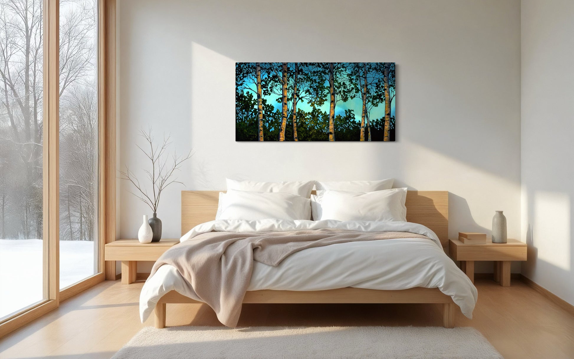 Bring the outdoors in with this original one-of-a-kind painting. On 1.5" wooden stretcher, sides painted black, ready to hang as is. Full of texture and layers of paint, this original artwork makes for a unique gift or addition to any space... home, office or cottage. Perfect size for over a couch, bed, feature wall or lobby.