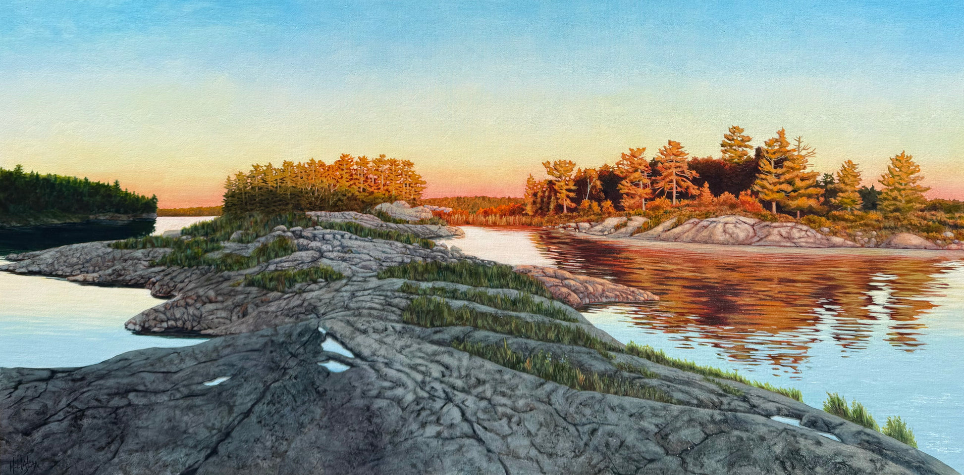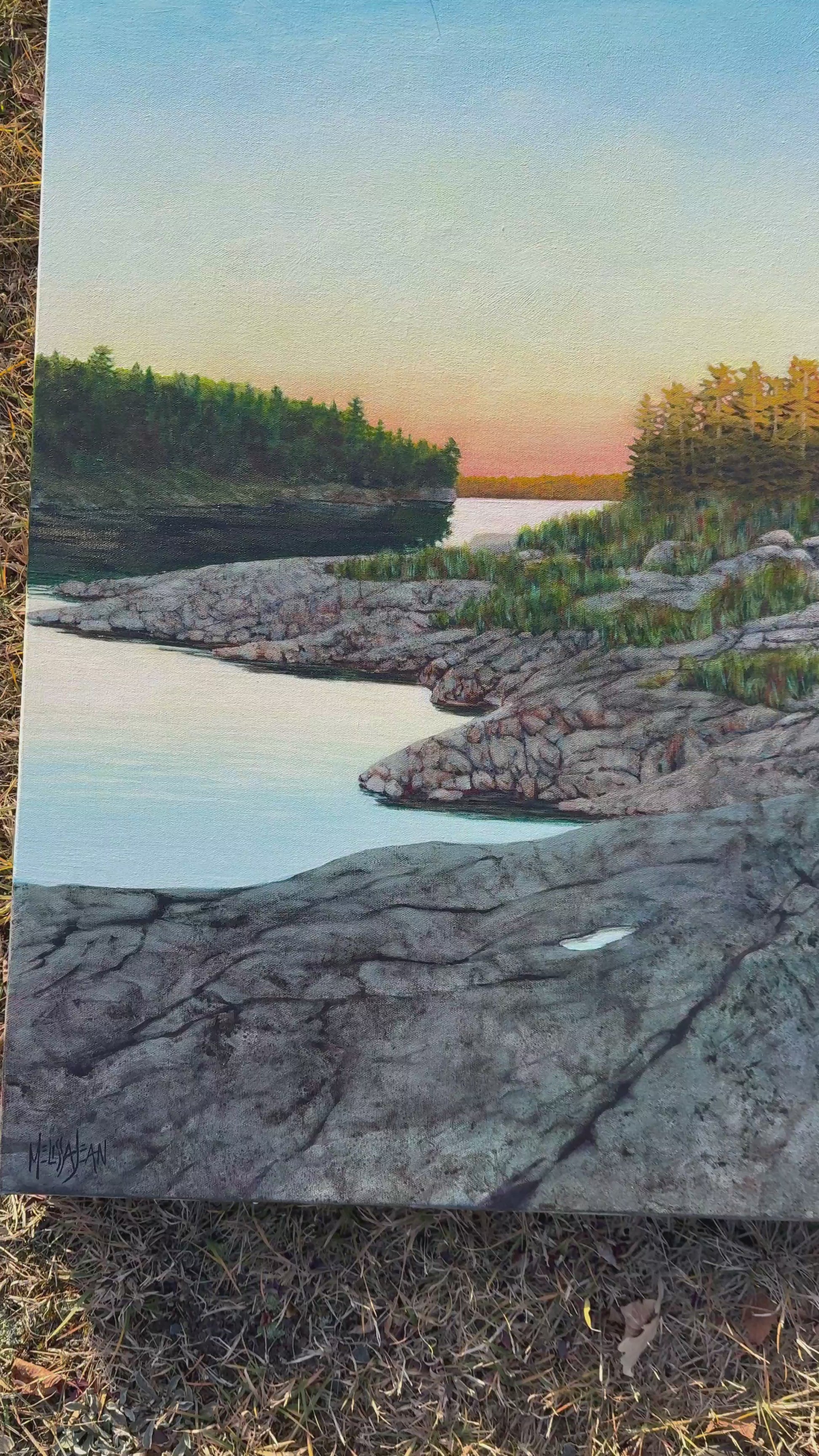 "It's become my favourite island this summer! I paddle boarded around it with Luna all the time, and it's fun to swim over to it from our rock as well! So much beauty so close to home, and it's different at all times of day. This painting reflects how it looks during sunset, just before the sun slips below the horizon." -MJ
