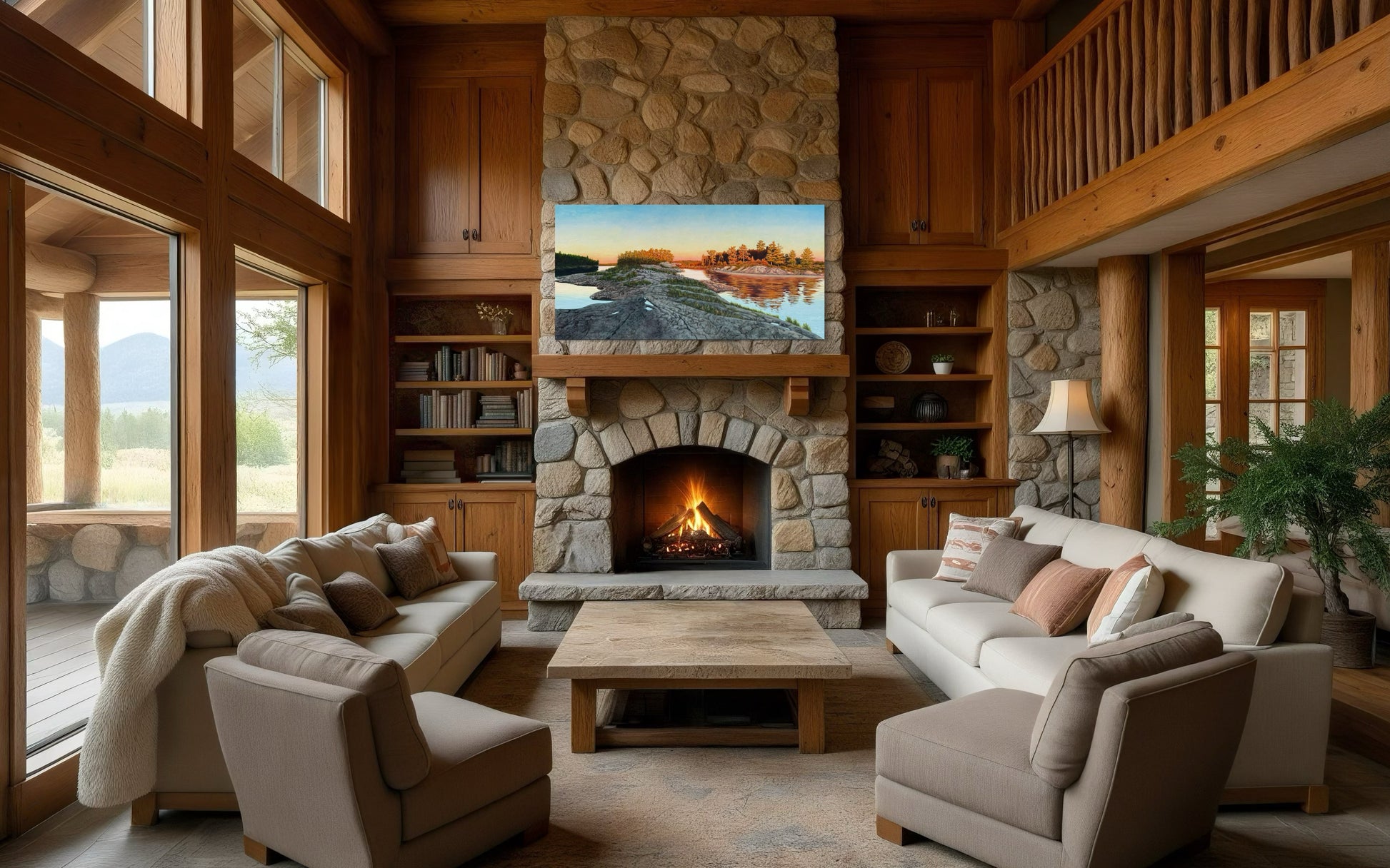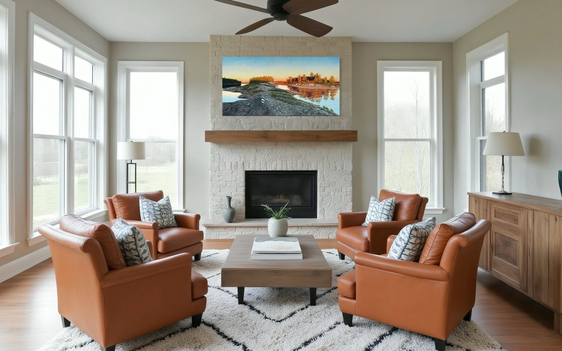 The “Last Light” painting captures the view we see from our living room window at the end of a summer day. The vibrant sunlight in the painting brings back our summer memories on LOW. The painting complements two prints by Melissa and completes our living room LOW theme. We are very pleased with this piece of art and will treasure in the years to come.