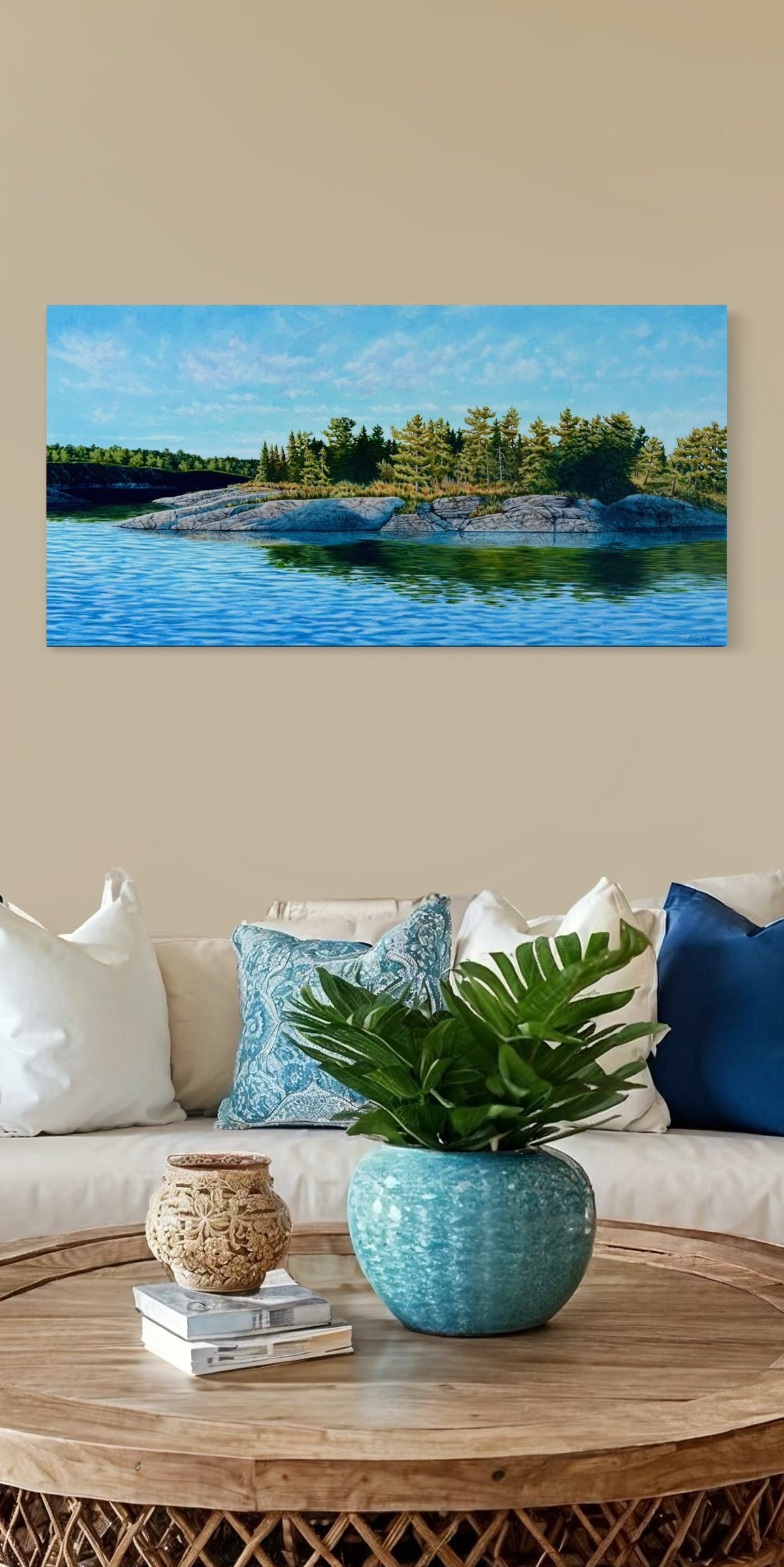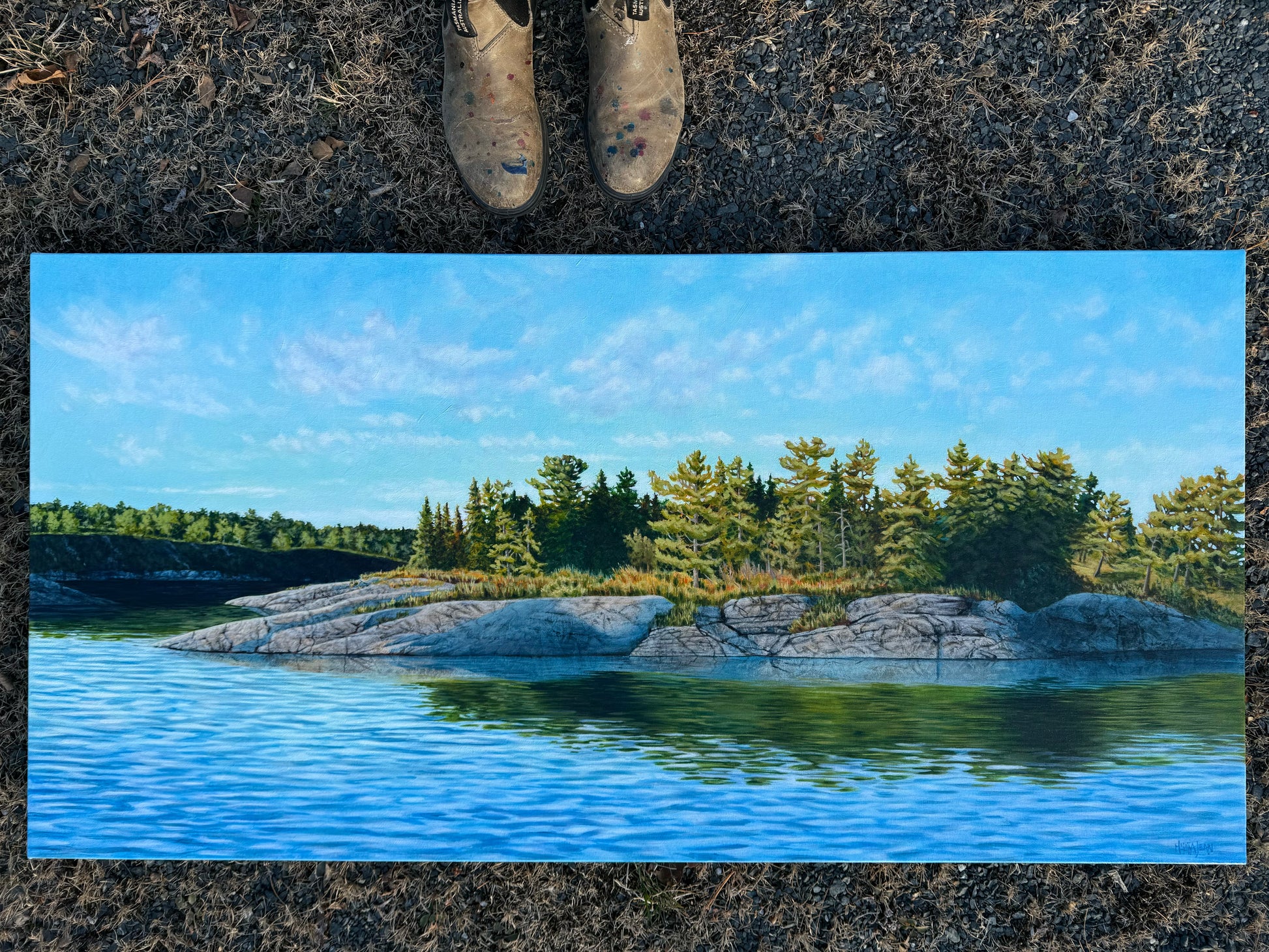 "It's become my favourite island this summer! I paddle boarded around it with Luna all the time, and it's fun to swim over to it from our rock as well! So much beauty so close to home, and it's different at all times of day. This painting reflects how it looks in the morning." -MJ