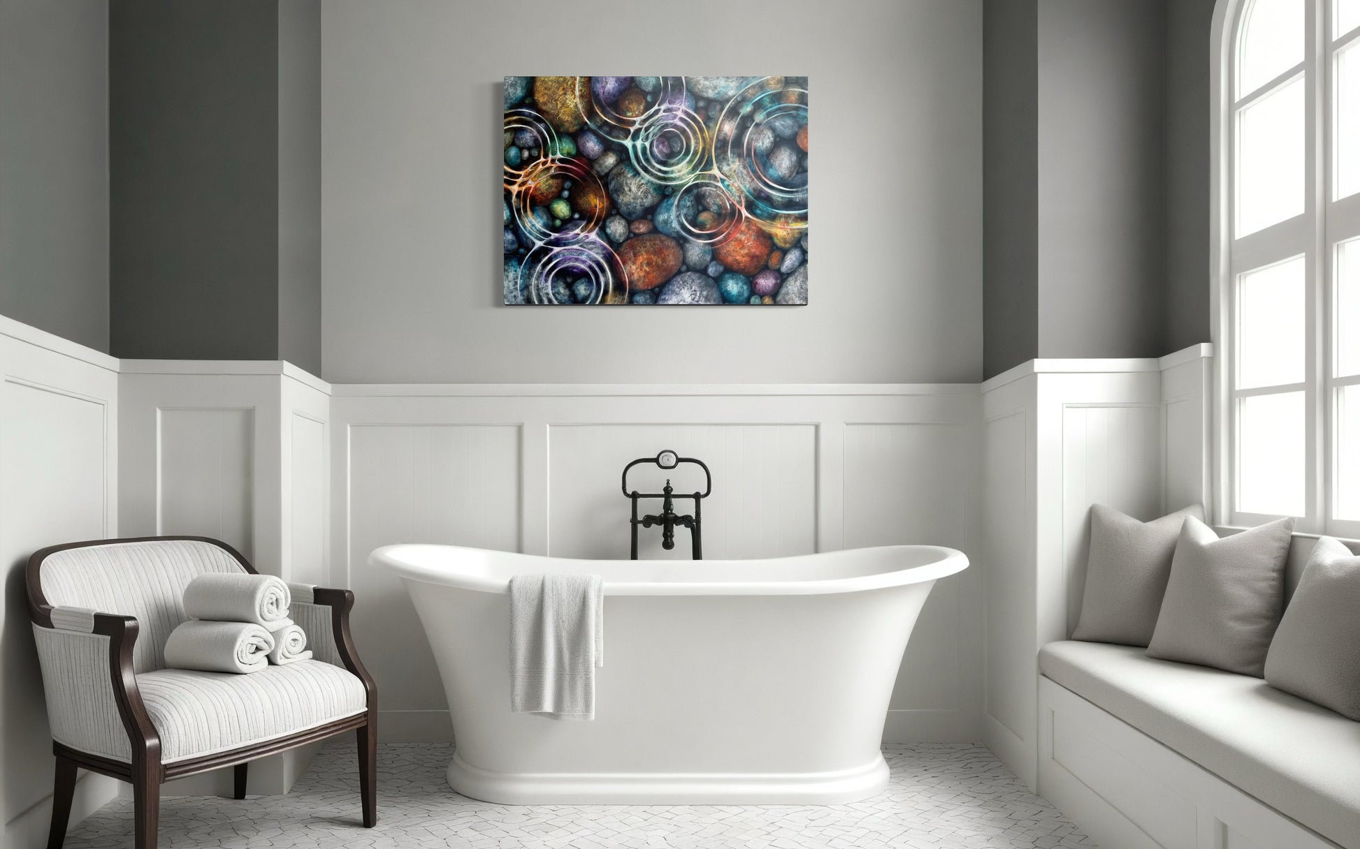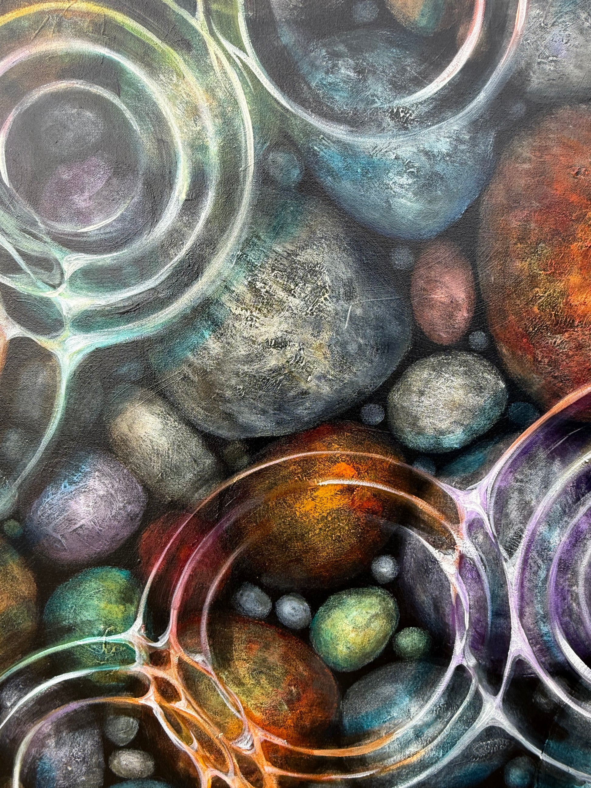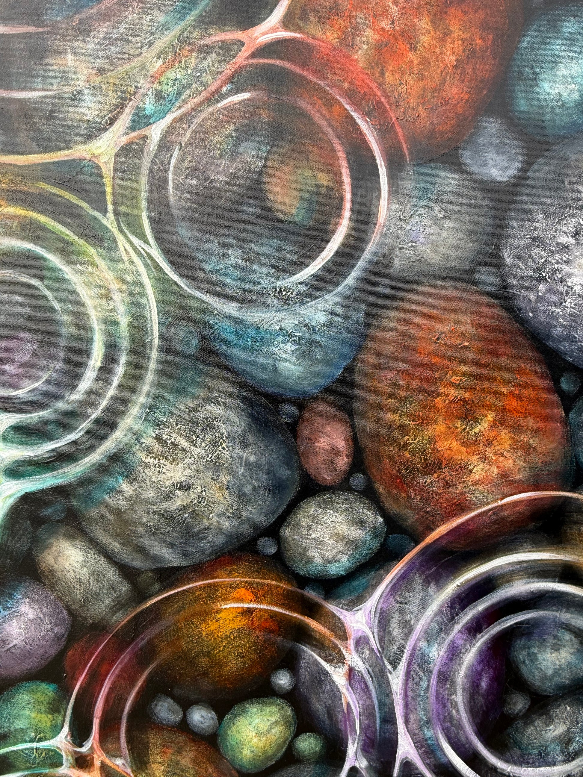 Bring the outdoors in with this original one-of-a-kind painting. On 1.5" wooden stretcher, sides painted black, ready to hang as is. Inspired by Hidden Gems and Soft Raindrops. The patterns created by the raindrops distort and carry the enhanced colours of the rocks under water, creating an abstract piece of motion. This painting is full of texture and layers of paint, and makes for a unique gift or addition to any space... home, office or cottage. Perfect size for over a couch or on a feature wall.