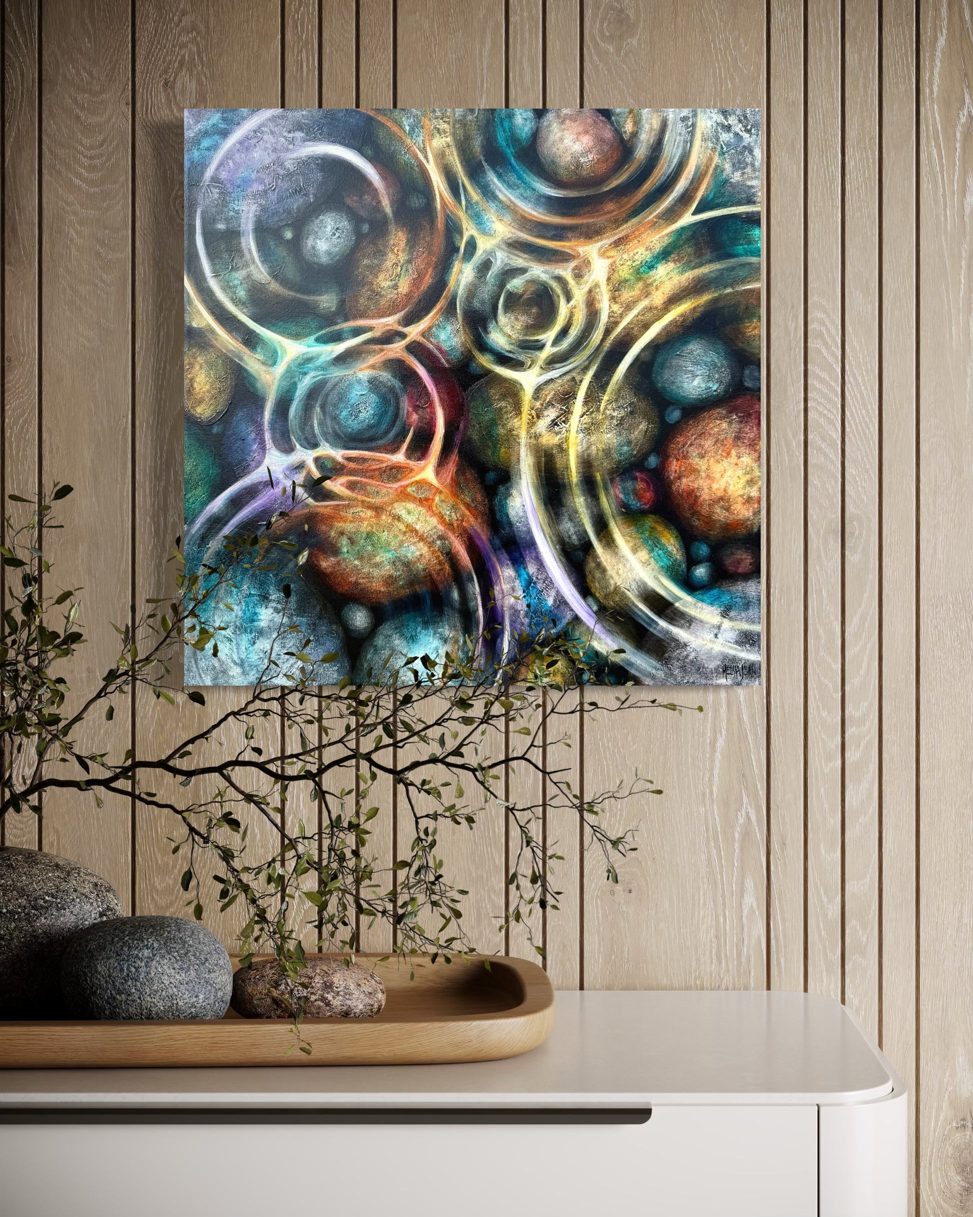 Bring the outdoors in with this original one-of-a-kind painting. On 1.5" wooden stretcher, sides painted black, ready to hang as is. Inspired by the hidden gems and soft raindrops. This painting is full of texture and layers of paint, and makes for a unique gift or addition to any space... home, office or cottage.