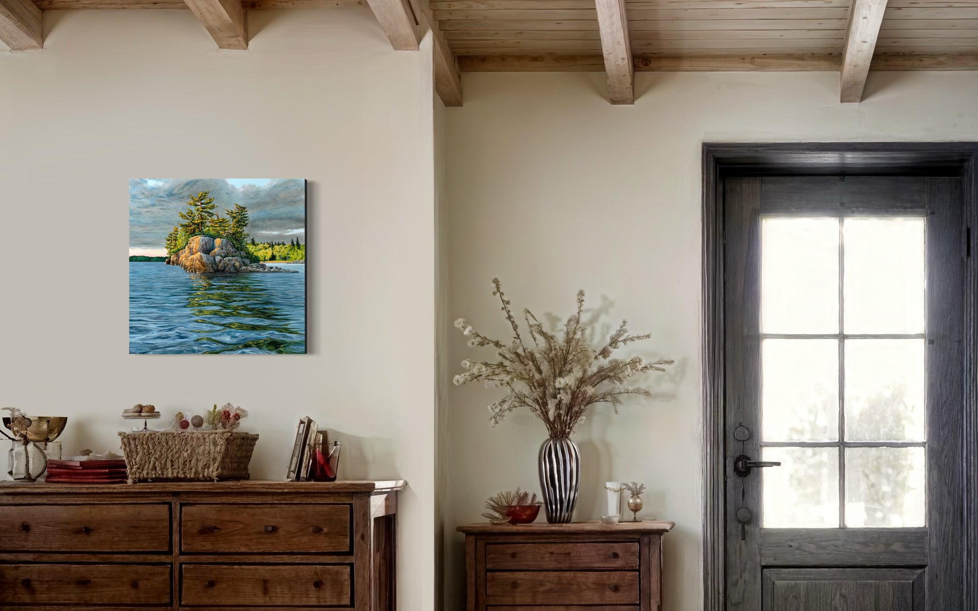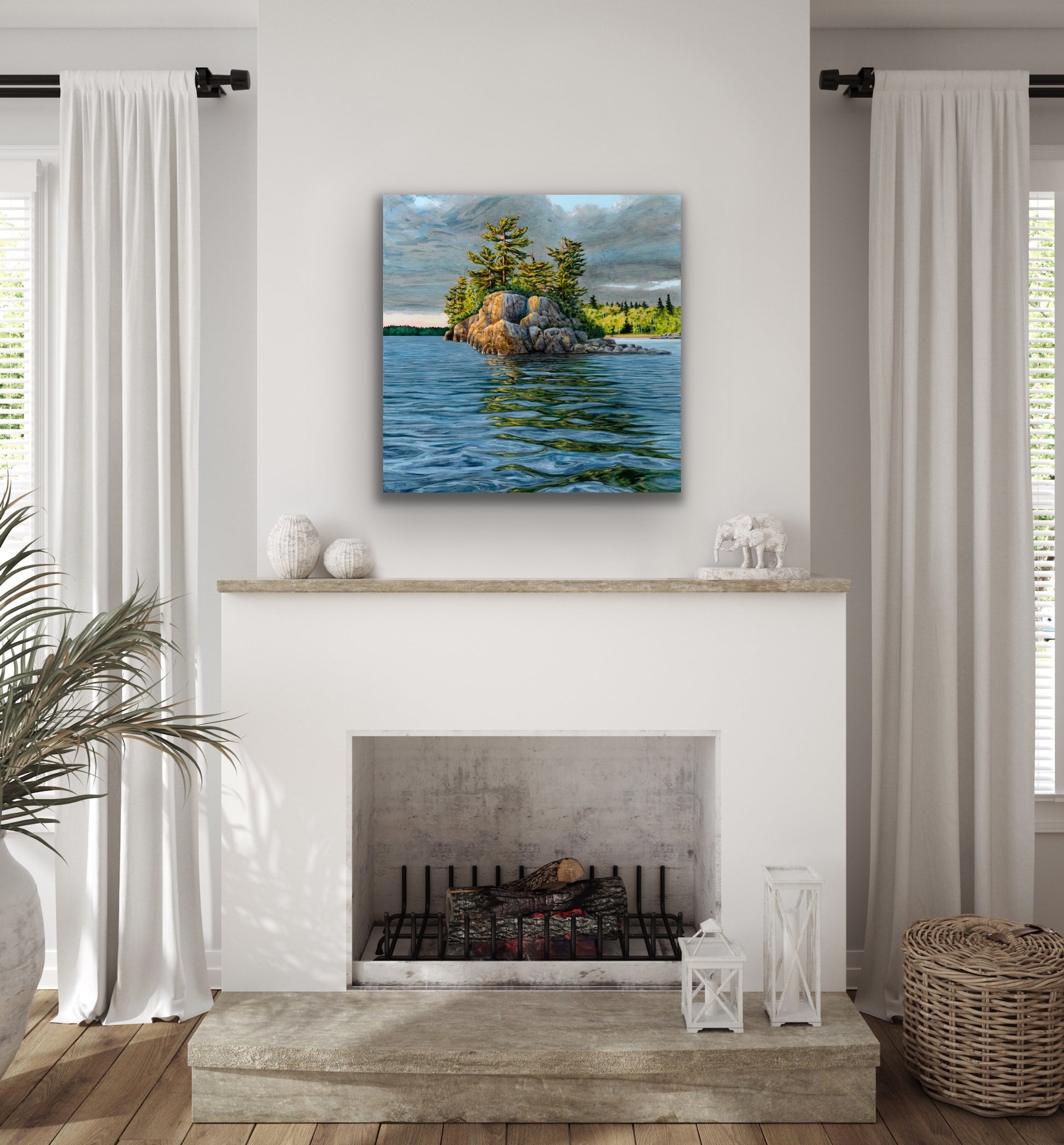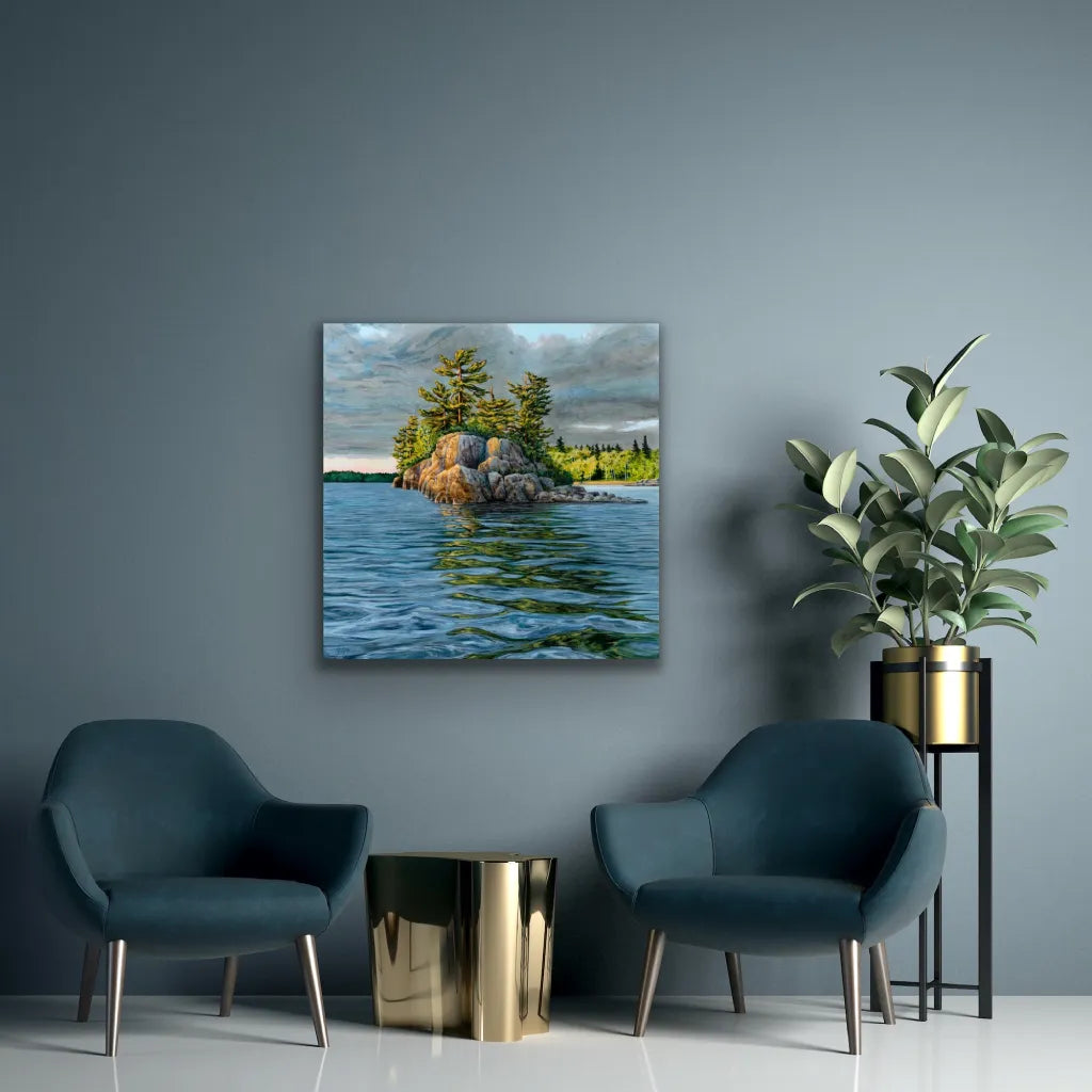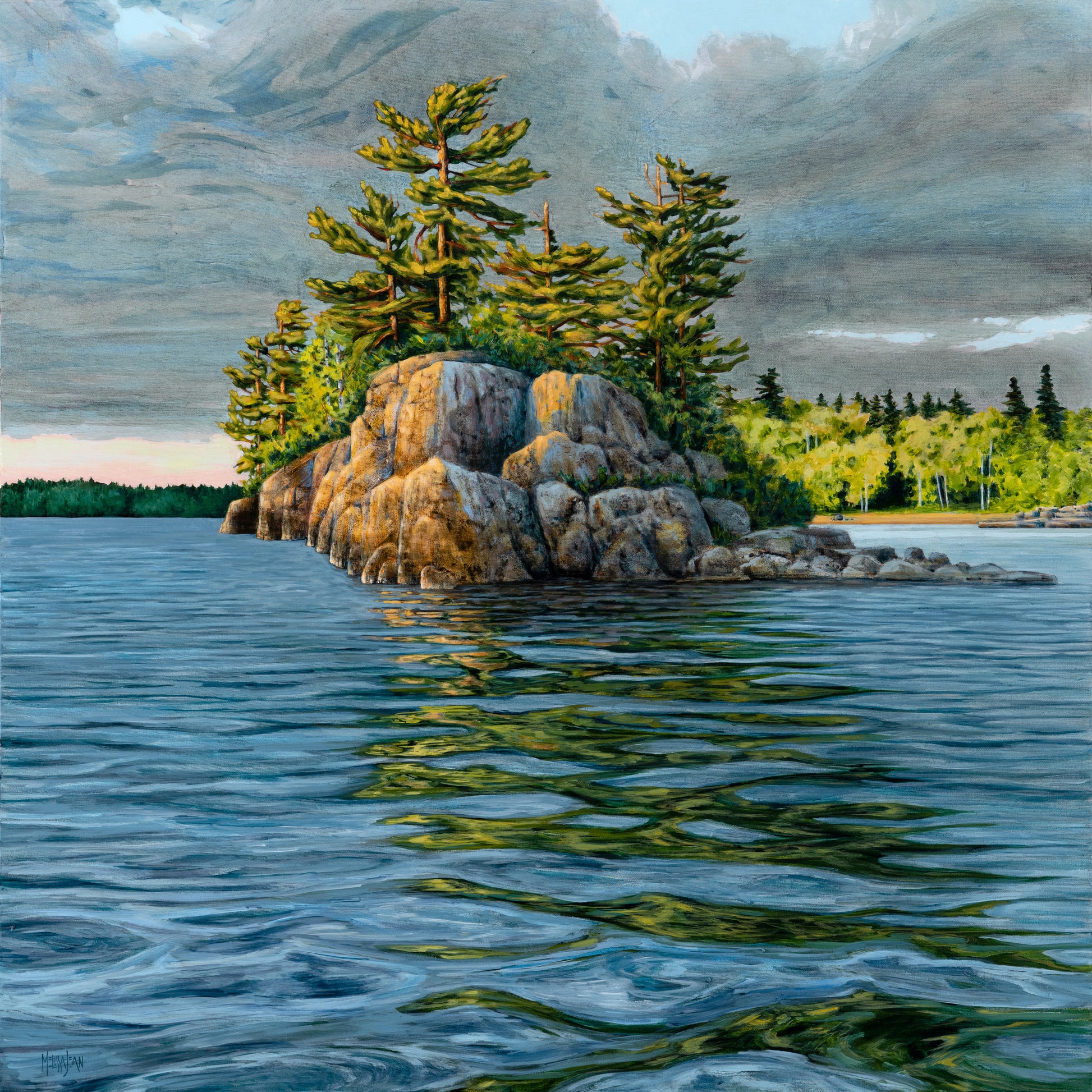 What inspired this painting: I've set up my easel of this island many times over the years... but approaching it head on one evening with the sun lighting it up so brilliantly inspired me to paint it... with the distant shorelines in the background lighting up, and the sun peeking through the clouds to illuminate the rocks and pines. I wanted to portray the smell of rain in the air, and the reflections gently swaying in the water.