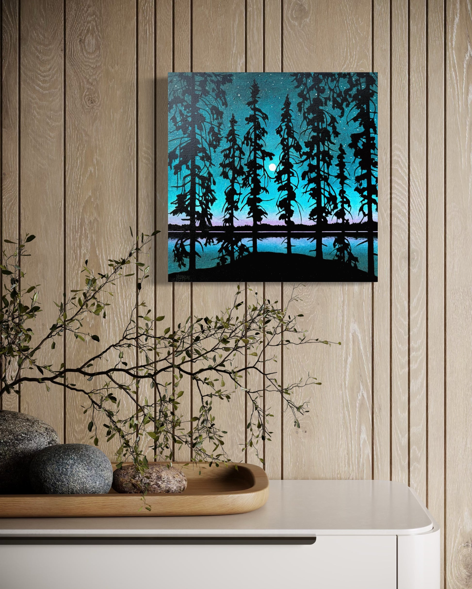 Bring the outdoors in with this original one-of-a-kind painting. On 1.5" wooden stretcher, sides painted black, ready to hang as is. Evenings by the Lake give me so much peace. A little stillness in the beauty of nature goes a very long way to a happy heart. This painting is full of texture and layers of paint, and makes for a unique gift or addition to any space... home, office or cottage. Perfect size for over a couch or on a feature wall.
